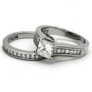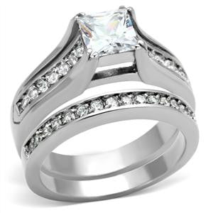 This stylish princess cut cubic zirconia wedding ring set is composed of high polished stainless steel and sparkling, clear colored stones. This setting features smaller, brilliant round cut accent stones accentuating this massive 3.40ct. center stone. A delightful piece of jewelry for any special lady.