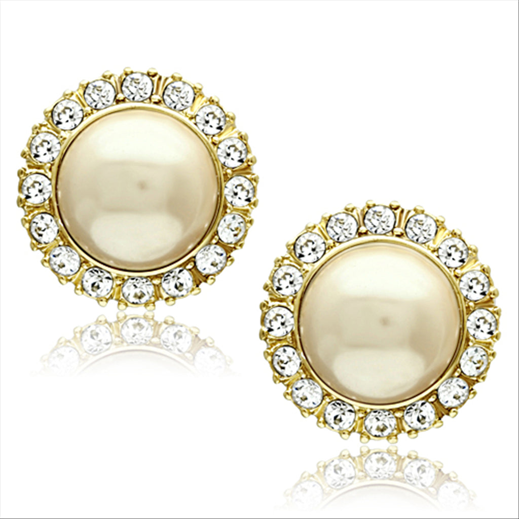 This elegant pair of stunning stud earrings is composed of radiant synthetic pearls and clear colored crystal pave. This stylish pair can be paired with your little black dress, work wear, and even casual looks. The possibilities are endless with these glamorous studs.